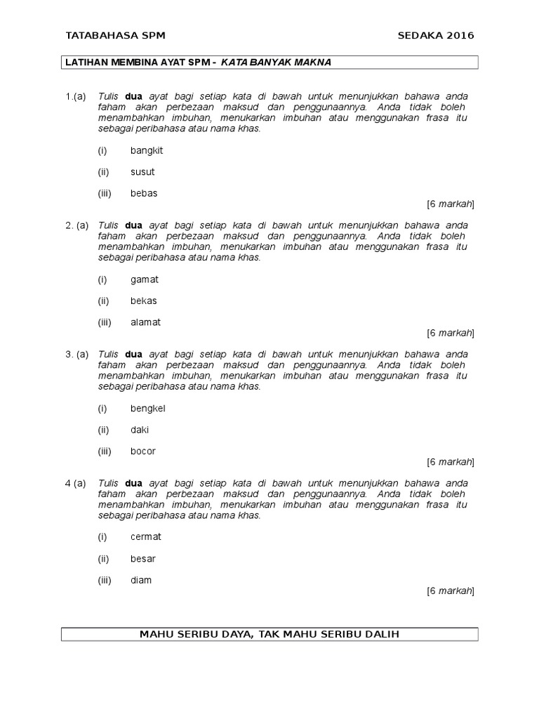 Anda diminta untuk membina dua ayat dan setiap ayat mesti membawa maksud kata yang diberi. Makna sesuatu perkataan akan berubah melalui pengimbuhan penggandaan dan pemajmukan. Ayat contoh ayat contoh merupakan pembuktian yang ingin dibuat selain.